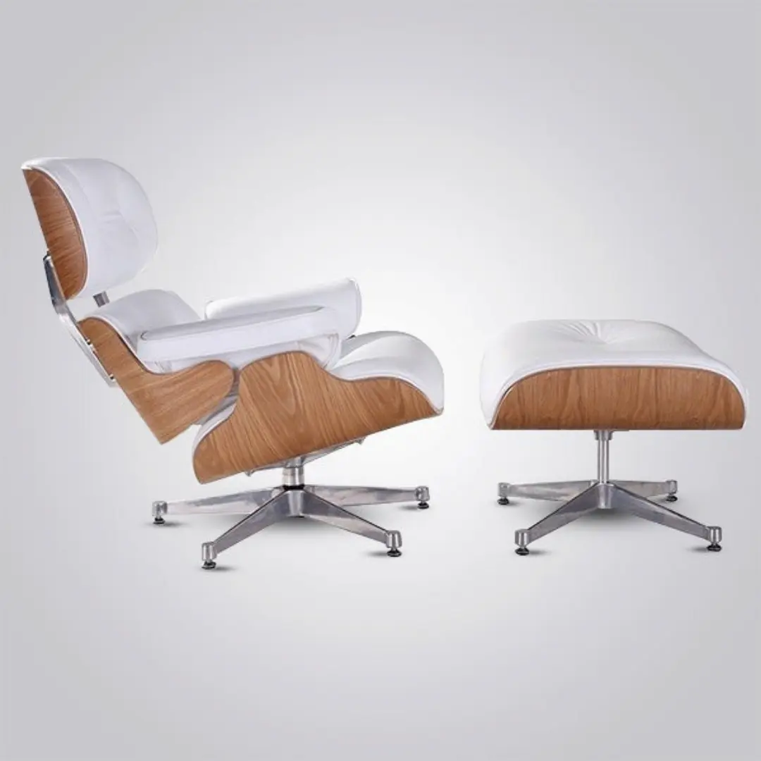 Classic Eames Lounge Chair & Ottoman – White Leather, Ash Wood & Chrome Base